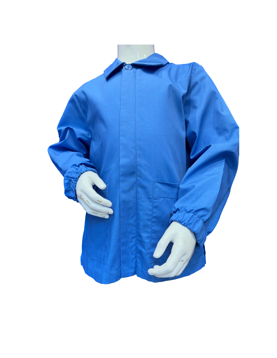 Realizzata in tessuto misto cotone (65% Poliestere - 35% Cotone), è disponibile in azzurro carta da zucchero e bluette. Caratterizzata da chiusura frontale con bottone e zip, colletto appuntito, tasche frontali e polsini elasticizzati, offre comfort e praticità per l'uso quotidiano.